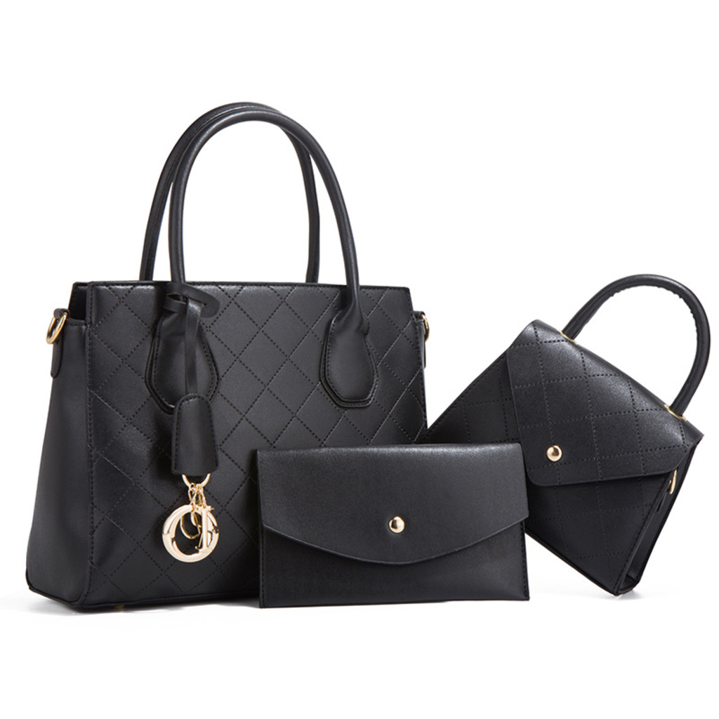 Черна кожена дамска чанта с две малки чанти